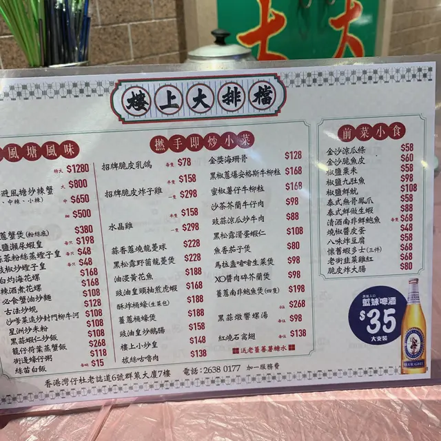 晚市六點開始,坐𨋢上到七樓,𨋢門一開,非常寬敞乾淨,四周佈置成灣仔街道,有夜總會,有當鋪,有麻雀鋪,仿如置身駱克道一樣,而在這些「店鋪」前的,便是蓋上紅膠枱布的大小圓枱,甚有舊日路邊大排檔的風情。