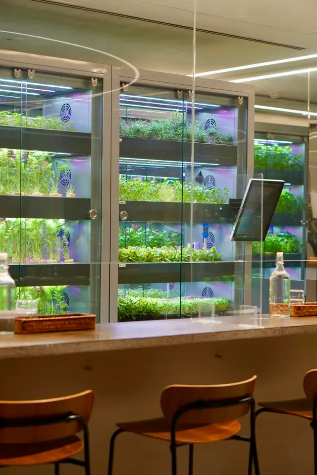 店面宽敞,极简风格,farm-to-table是一大亮点,在这里能拥有坐在温室蔬菜面前吃饭的别样体验,厨房还配备有烤披萨的砖炉。