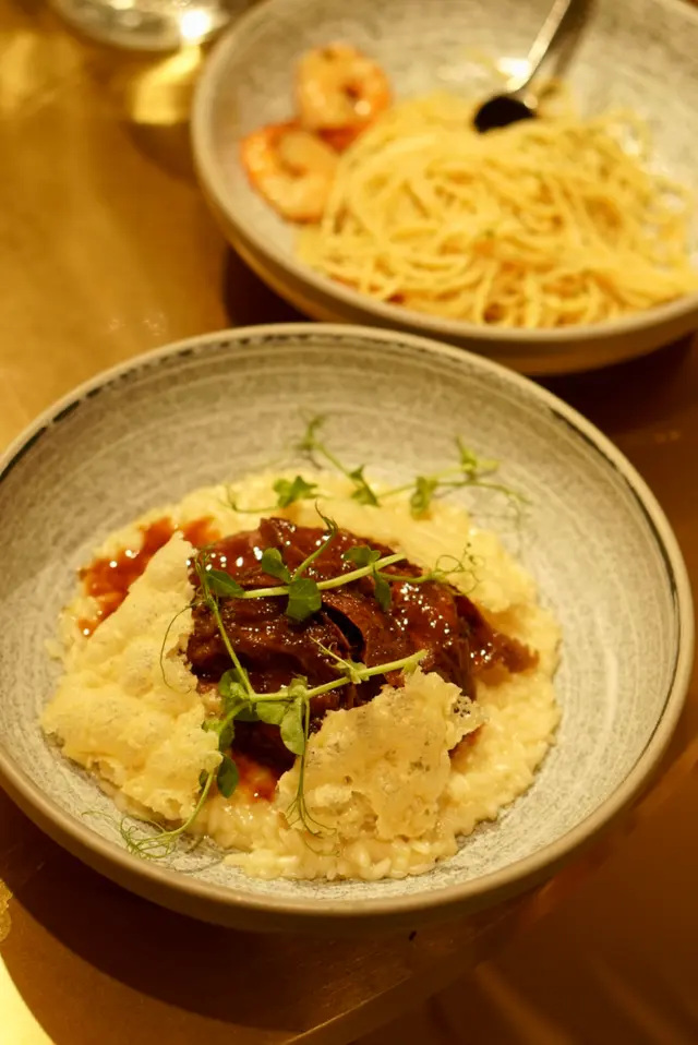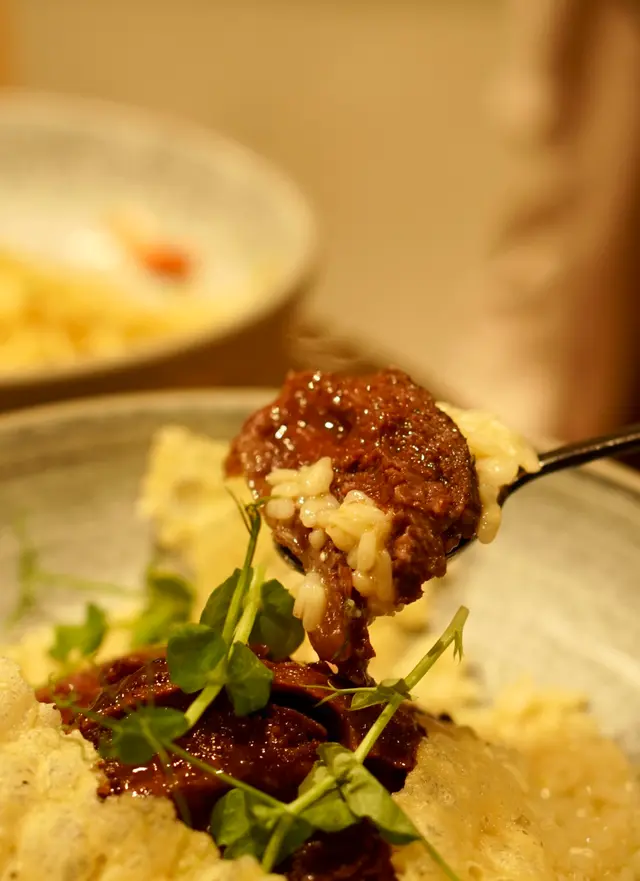 这家调味整体克制,意面和烩饭都很清淡,吃下来没什么惊喜。好在beef cheek品质还是在线的,肉味浓郁、软腍柔韧。米饭嚼劲十足,收汁正好,既有黏糊糊的浓稠质地,也没有过多奶油。
