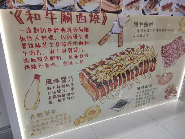 👉🏻呢度有和牛嘅創新食法,鐵板和牛被一層蛋液包裹,再喺面上加芝士和柴魚片點綴。和牛同雞蛋的特別配搭,加上Osaka風味醬汁,別有一番風味。