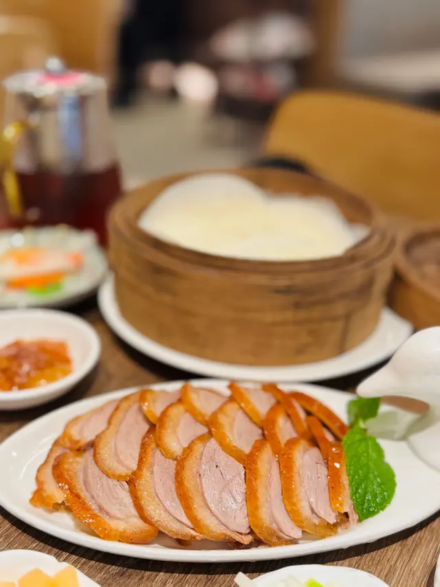 接下來是烤北京填鴨(半隻),採用傳統京式掛爐烤製,鴨皮鬆脆,肉質鮮嫩。我特別欣賞那薄薄的餅皮,不會讓人感到過於飽脹。