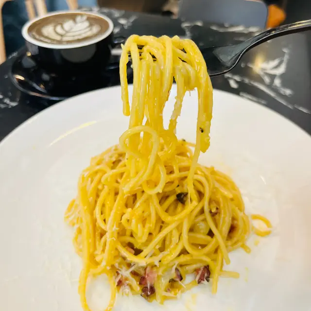 今日得自己一個又好肚餓,叫左個carbonara試下,再加埋我最鐘意嘅hojicha latte (呢個飲品唔係周圍有咖) !