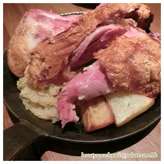壓軸出場的,當然是德國有名的豬手「脆皮燒豬肘配酸椰菜及薯仔」。店員先把原隻脆皮燒豬肘揣上桌,讓食客相機先食。