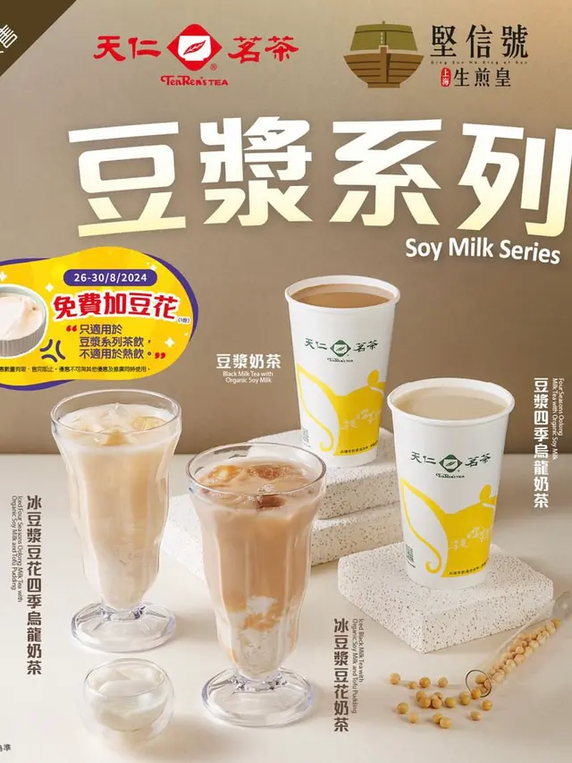 1. 於天仁茗茶一田分店購買任何聯乘茶飲即送一張堅信號指定小籠包半價優惠卡。