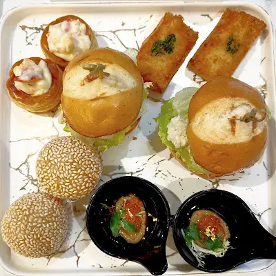 咸點仲有燉鮑魚伴金箔、沙律醬蝦多士、流沙紫薯煎堆仔、法式蟹肉鵝肝包同埋法式慢煮龍蝦酥盒,大大件同埋味道都幾啱我心水認真唔錯喎。