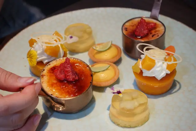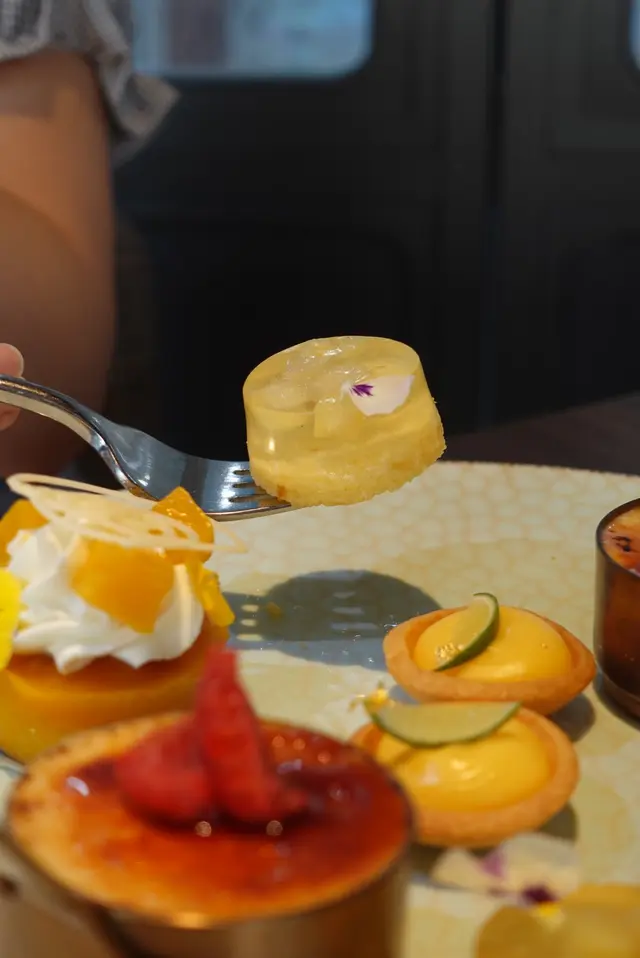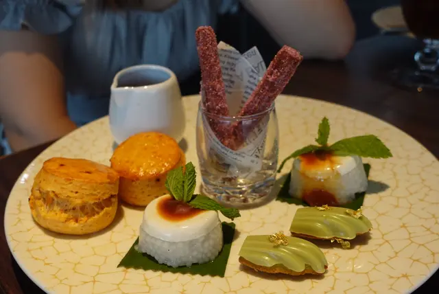當中蟹肉沙律小金杯、斑蘭朱古力馬德蓮同青檸椰子西米糕都有南洋風特色,