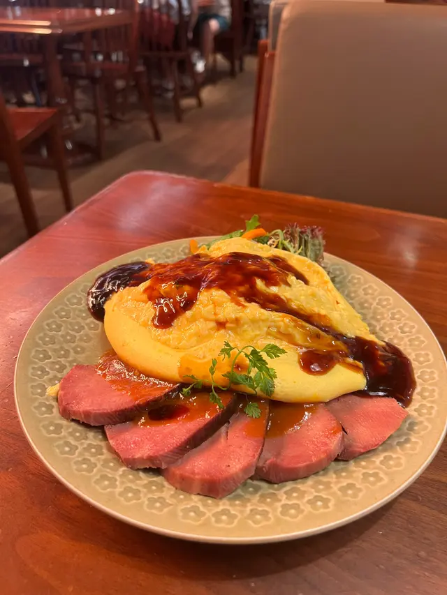 這道菜將日式蛋包飯與炭烤牛舌結合,切開嫩滑的半熟蛋,裡面包裹著粒粒分明的炒飯,頂層鋪上煙燻風味的厚切牛舌,肉質軟嫩帶炭香,淋上微甜的醬汁,整體層次豐富。