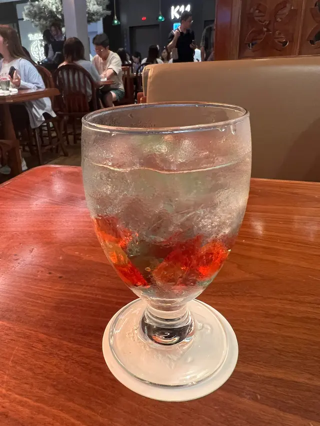 - 夏祭金魚梳打:藍色蘇打水搭配荔枝糖漿,杯底有「金魚」造型的寒天凍,味道清爽微甜。