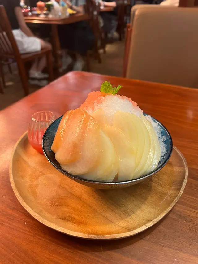這款刨冰以祭典煙火為靈感,碎冰堆成小山,淋上白桃糖漿,頂層鋪滿新鮮白桃果肉,入口冰涼清甜,白桃香氣濃郁。