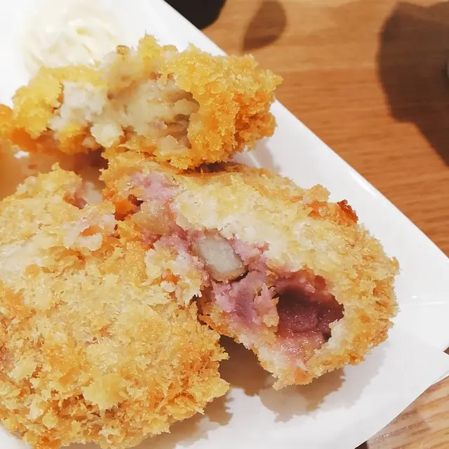 一客就有牛肉薯餅同紫薯甘栗兩隻口味,幾啱獨食嘅我。炸皮麵包糠好薄好碎,炸起嚟鬆脆輕盈。