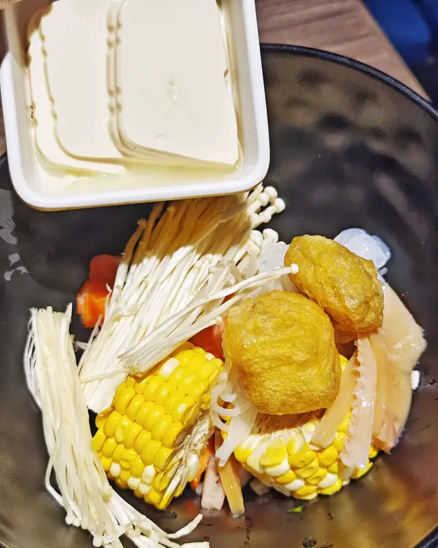 自助區💪嘅火鍋配料都非常豐富,例如有金針菇🍄、粟米🌽、水魷🦑、豆腐同埋唔同嘅丸類,任君選擇。