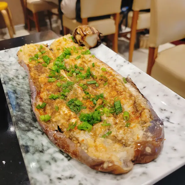 🧄蒜蓉燒原條茄子嘅蒜蓉多到好似瀑布咁澎湃,茄子肉滑溜到一啜就入口😍