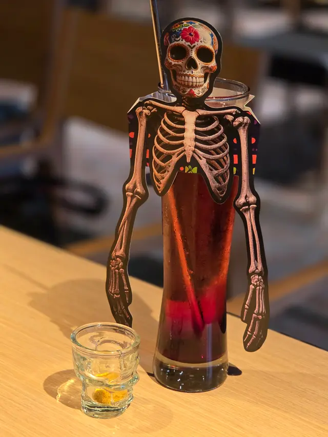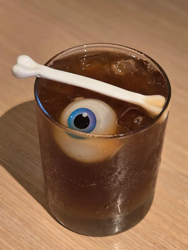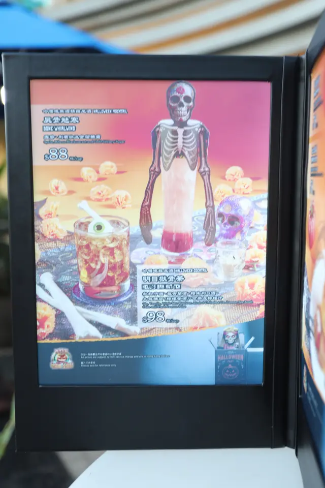 名字驚嚇的「哈囉喂雞尾酒」名叫「明目獄骨茶」($98),成份甚多,有杜松子酒、龍舌蘭酒、橙味利口酒、特別的檸檬茶酒、可樂和檸檬汁,杯中大大隻的眼球裝飾和白骨造型的攪拌棒,相當吸睛。另一款名字同樣嚇人的「哈鑼喂無酒精雞尾酒」名字則是「屍骨魅寒」($88),成份雖然比較簡單,只有雪碧、利賓納和金箔糖霜,但喝前只要把金箔糖霜倒進高身濶口,以骷髏骨頭裝飾的玻璃杯內攪勻,本來紫紅色的雞尾酒便會呈現金光閃爍的效果,煞是特別。至於為小朋友而設的特飲,甚有立體感的銀色矮身杯子上戴上了一頂紅色的牛仔帽子,造型有趣。