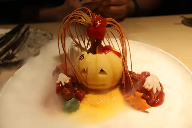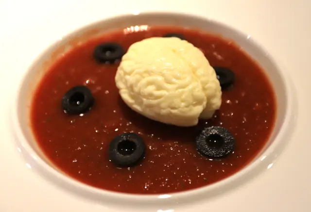 這套餐包括三道名字特別,擺盤充滿萬聖節氣氛的菜式,第一道菜式名叫「絞盡腦汁」,其實是消暑醒胃的「蕃茄凍湯配帶子慕絲」。這色澤深紅,以黑橄欖和帶子慕絲點綴的蕃茄凍湯,份量極多,彷如血池,酸度適中,十分開胃。湯中滿是皺褶,造型有如人腦一樣的,其實是打成慕絲狀的帶子,又白又滑,口感特別。