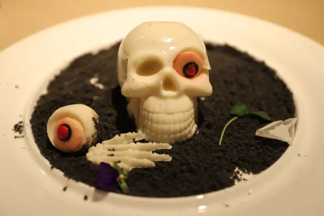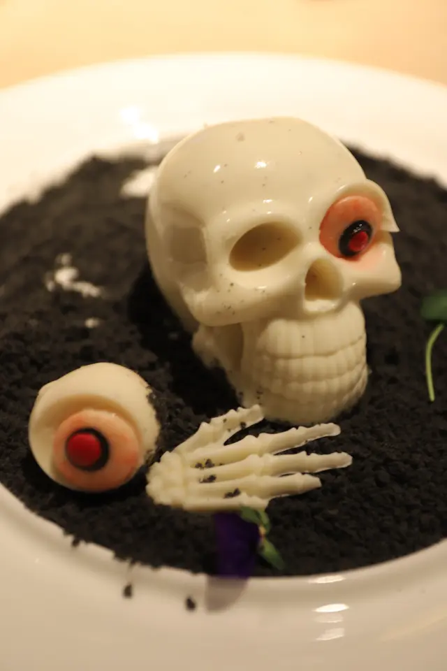 最後一道甜品的名字則是「出土芙蓉」,其實是「椰汁布甸配竹炭曲奇」。這賣相精緻,樣子顯得最為嚇人的甜品,墊在白色骷髏骨頭、掉下來的眼珠和鬼手下的,是細碎的黑色竹炭曲奇。口感脆脆的,白色的骷髏骨頭、眼珠和鬼手,則是口感滑如凝脂,椰子味道香濃,甜滋滋的椰汁布甸。椰汁布甸配竹炭曲奇的配搭,無論口感和味道,我都喜歡。