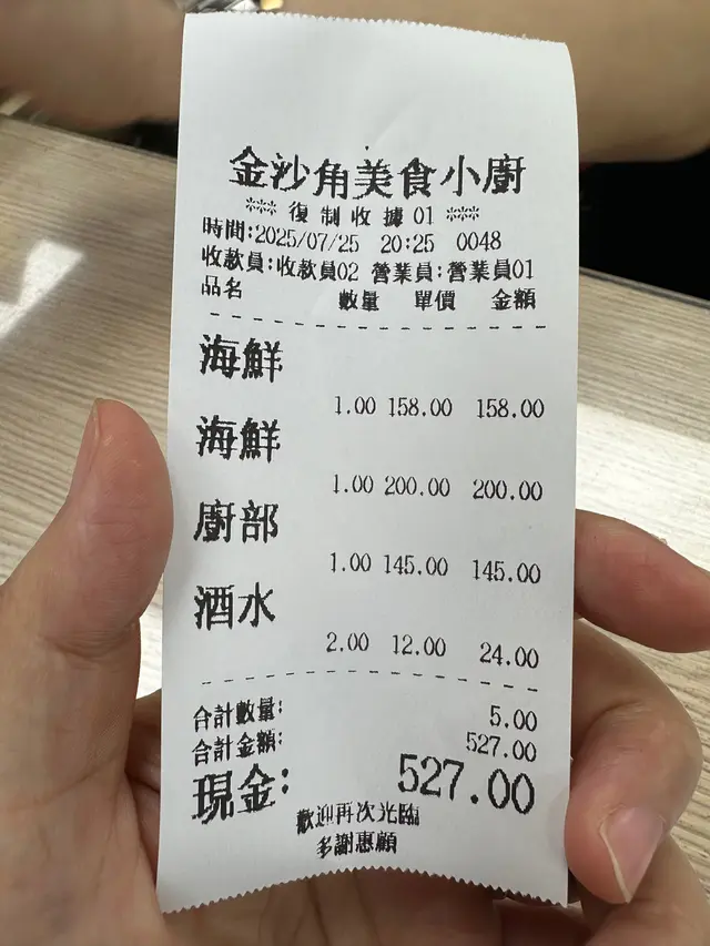 夠鑊氣,夠大碟,夠抵食,夠新鮮,夠好味 Master Taste 8等级42025-07-27298 浏览 关注 一放暑假,有小孩嘅朋友終於可以解放,久違了大半年嘅2人組,即刻約埋去博康邨熟食中心嘅金沙角美食小廚聚聚。我哋坐喺廚房出菜位,見到一碟碟色香味俱全、份量十足嘅小菜,真令人食指大動,口水直流。我點咗蒜蓉開邊蝦,蝦肉鮮甜,蒜蓉嘅香味正好唔會掩蓋蝦嘅味道,口感一流。碧綠海中寶用咗西蘭花,配上帶子同花枝片,色彩靚,西蘭花脆口,海鮮嘅鮮味更添層次。薑蔥炒蟹真係超新鮮啖啖肉,勁多蟹膏,薑蔥嘅香味提升咗整體風味,超正。呢間餐廳嘅小菜真係值得一試,色香味俱全,份量大超足料,服務又好,適合同朋友聚餐。下次再約埋多啲人一齊嚟!22以上食记乃用户个人意见 , 并不代表OpenRice之观点。赞好分享夠鑊氣,夠大碟,夠抵食,夠新鮮,夠好味 金沙角美食小厨 https://s.openrice.com/QrLT0iALT00检举 张贴 评分5味道4环境5服务4卫生5抵食用餐日期2025-07-26等候时间5 分钟 (堂食)人均消费$142 (晚餐)