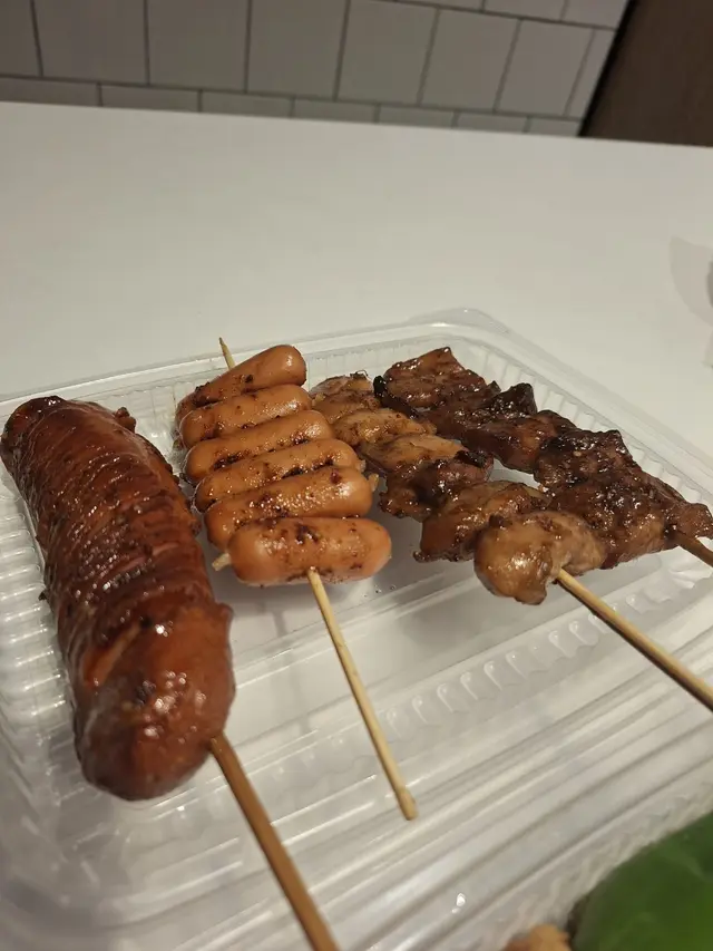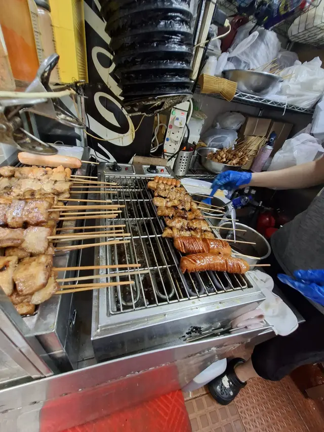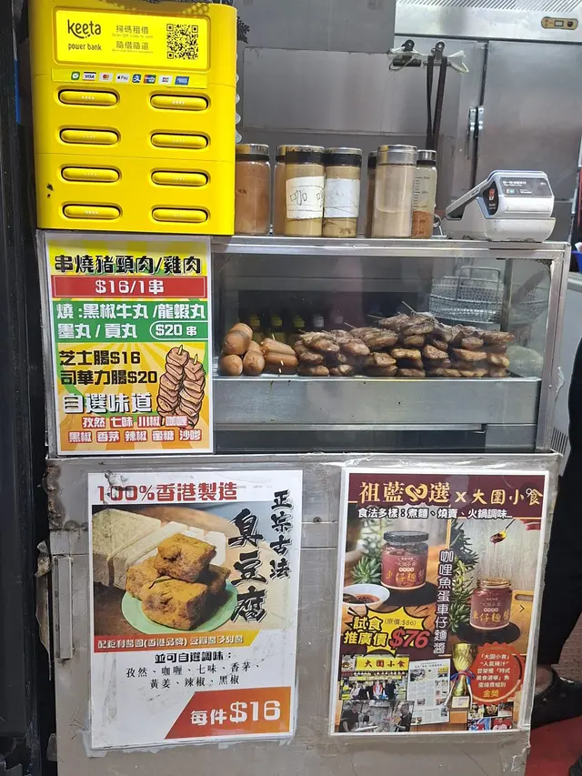 炭火香氣濃郁❗豬頸肉🐷油潤爽脆,帶有焦邊;雞肉🐓嫩滑,蜜糖🍯及沙嗲汁甜咸交織;芝士🧀腸爆漿流心,邪惡度滿分。司華力腸外皮爆脆,內裡肉質緊實有嚼勁,越嚼越香。即燒🔥即食,熱辣燙口,香氣撲鼻,係「掃街」嘅必食之選💕