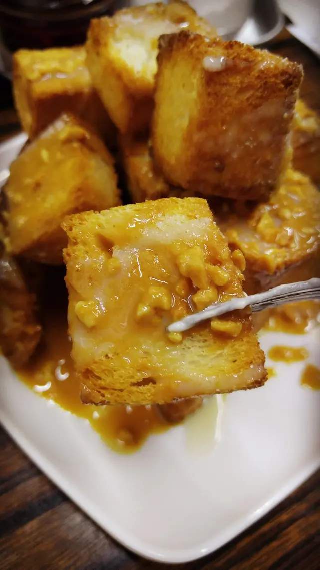 好東西就是要等待,一個就像金字塔搭到三層高的多士,粒粒焗到金黃色,面層加上花生醬、煉奶、砂糖