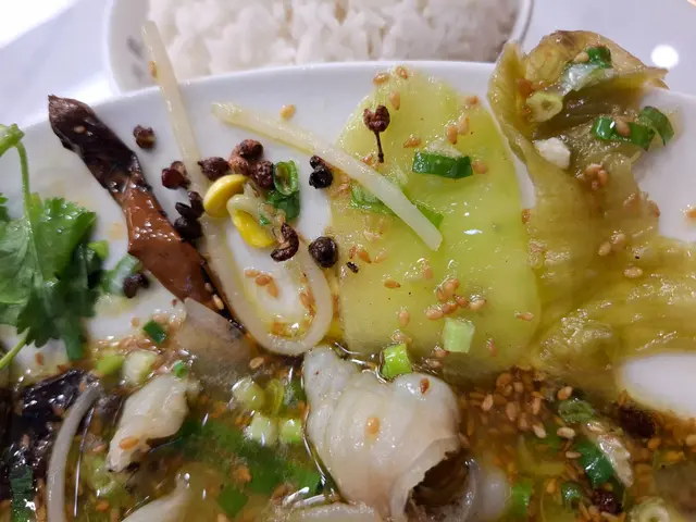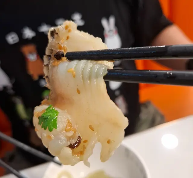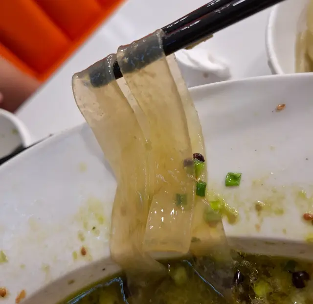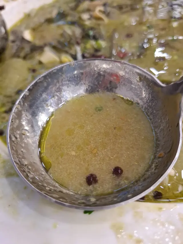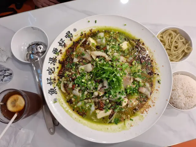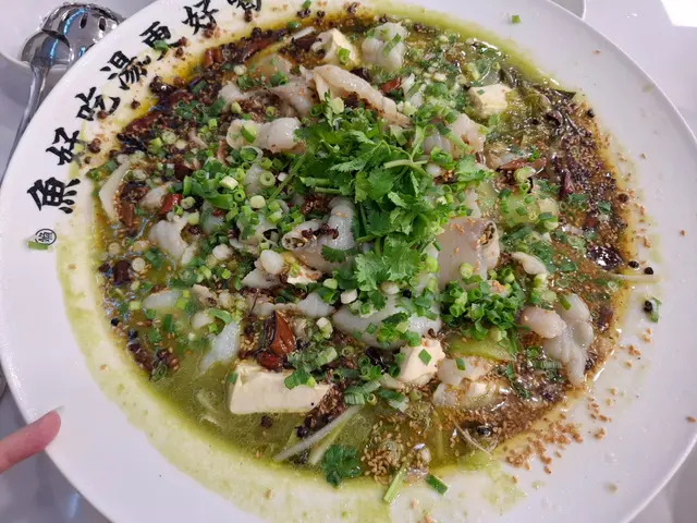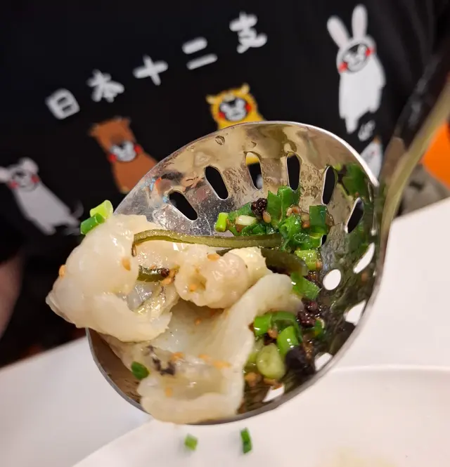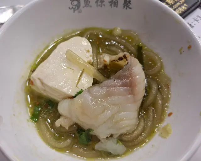 在表面佈滿青bb藤椒油的湯底夾出彎彎的鯛魚,魚肉沒有鬆散/分裂。