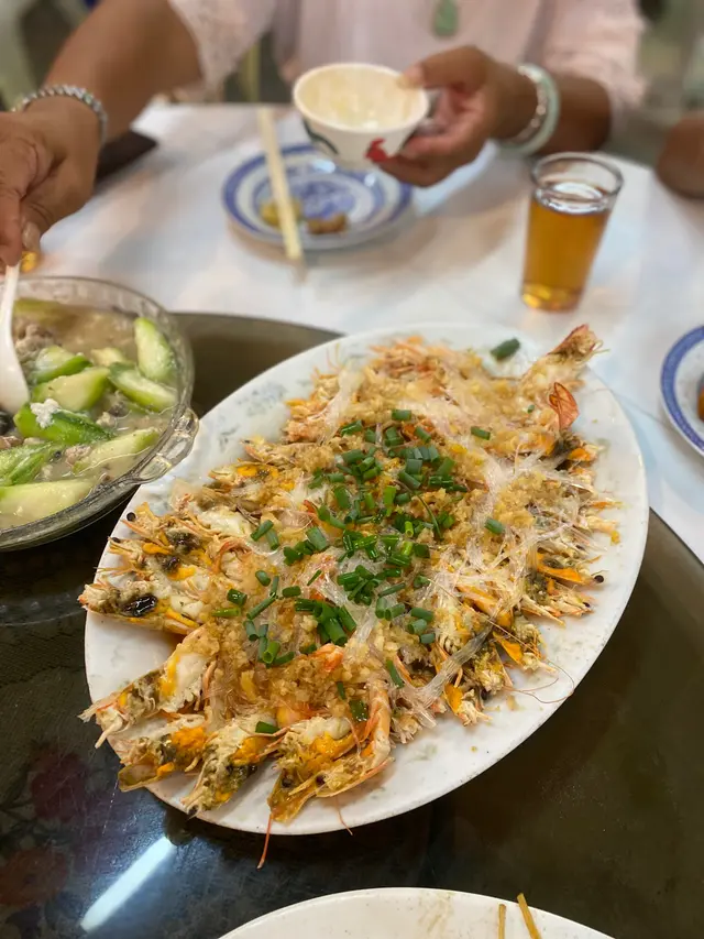 蒜蓉開邊蒸蝦:蒜蓉粉絲均勻地佈滿海蝦表面,粉絲吸曬蒜蓉精華,海蝦偏半生熟,蒸蝦吾洗蒸太熟,食落粉嫩,充滿蝦膏鮮味,略嫌帶點腥,但都係新鮮嘅表現。