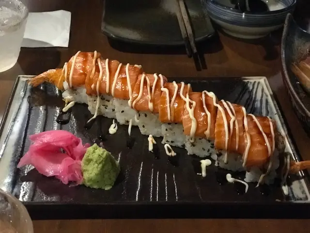 面層舖左塊厚切三文魚,卷物餡有青瓜,芝士同埋吉列蝦,再淋上少許沙律醬和豉油