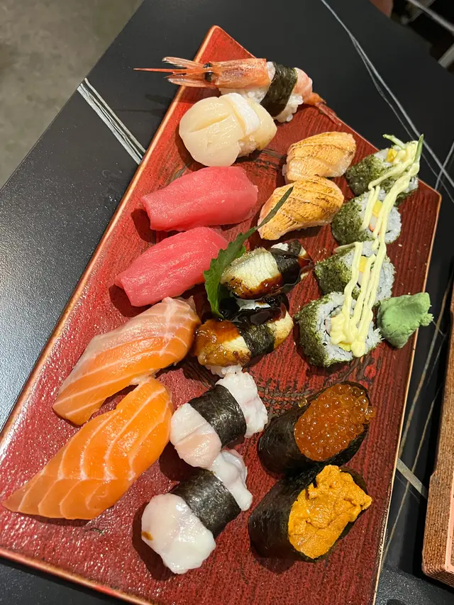 一上枱已經覺得好抵食超滿足,啱晒我呢啲有選擇困難症嘅人!呢個壽司拼盤嘅用料好豐富,有齊:三文魚腩、火炙三文魚、八爪魚、吞拿魚、鰻魚(各2件),仲有海膽、帶子、三文魚籽、有頭甜蝦(各1件)同埋反卷(3件)。