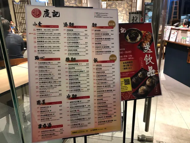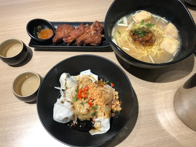餐廳裝潢挺有feel的,採用電話落單,點了生煎胡椒包、紅油百花抄手、香酥排骨拼滷肉慶麵、麻辣擔擔麵及飲品凍豆漿兩支。