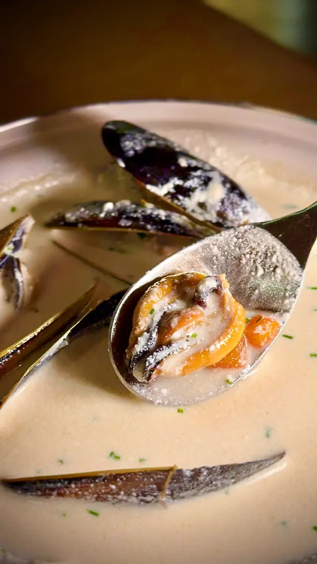 自家特調白酒忌廉汁藍青口配薯條及蛋黃醬