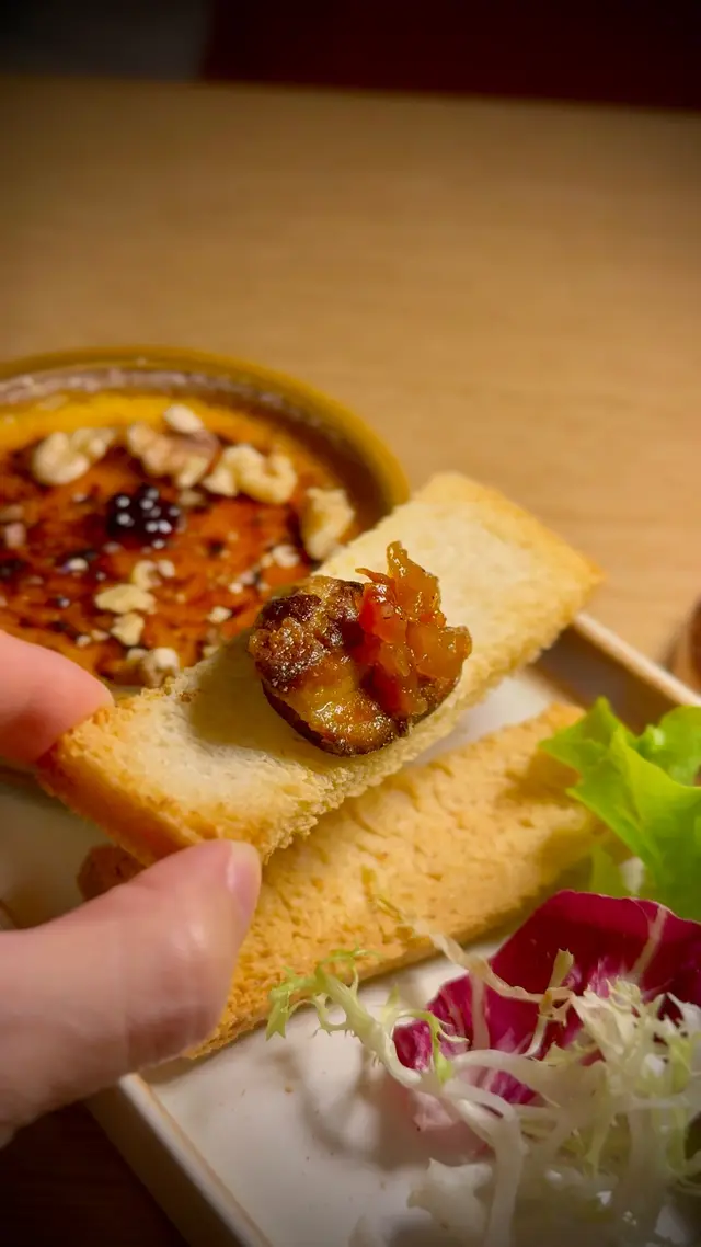 鴨肝同焦糖燉蛋冇諗過可以咁夾,食落口感非常順滑,每一啖都食到鴨肝嘅香味,用嚟配多士食一流。