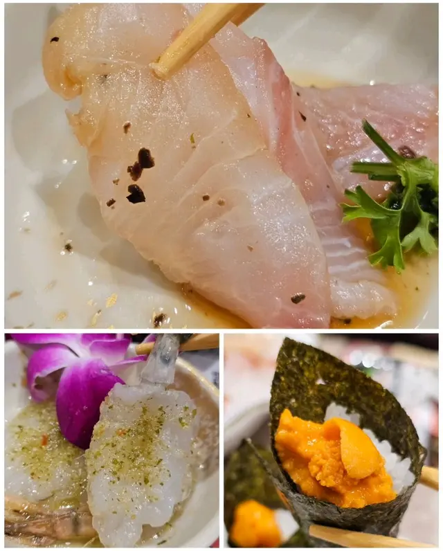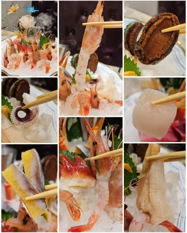 松葉蟹腳、磯煮鮑魚、珍寶赤海蝦、鮮帶子、油甘魚、挪威三文魚、象拔蚌、俄羅斯甜蝦、北寄貝、赤貝、希靈魚、酒煮榮螺等等刺身都是必食喔~