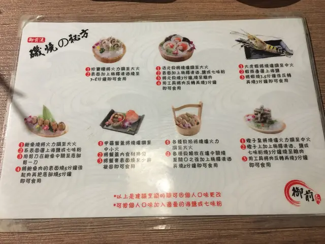 首先,店員會送上一份磯燒時令海鮮盤,有五款特選海鮮,包括大大隻鮮嫩多汁的珍寶蠔,好香好濃滑的蟹味噌甲羅蟹蓋,又大隻又爽彈又新鮮的大虎蝦,鮮甜的活元貝及爽口美味的鮑魚。店員會首先簡介每款海鮮燒的時間,如果唔記得,枱上還有指示咭提示每款海鮮要燒的時間。