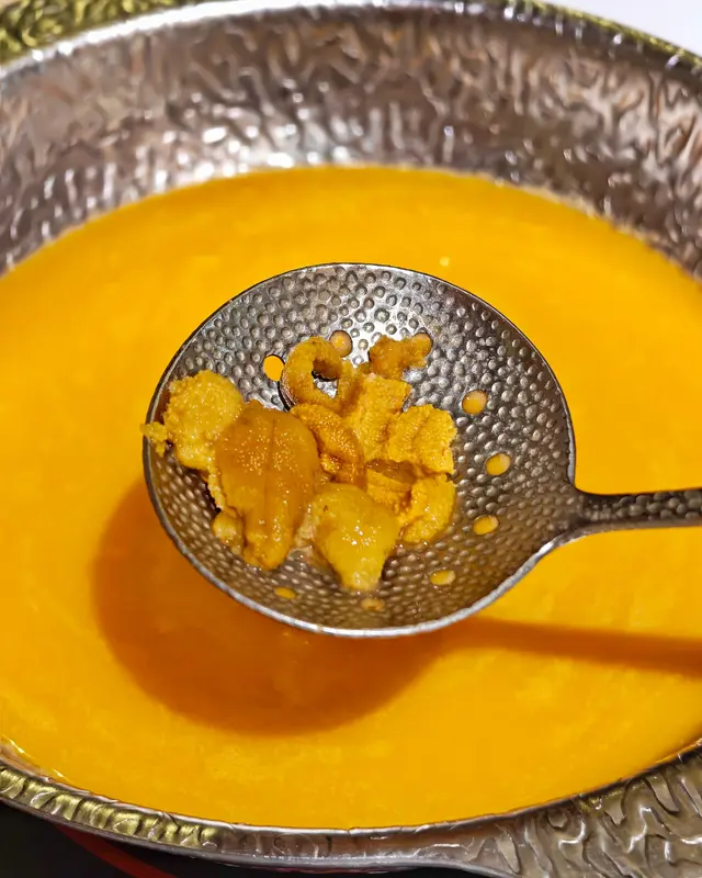 朋友仔就揀咗佢哋嘅招牌💛北海道海膽高湯(+$58),呢個湯底色澤艷麗到令人流晒口水🤤,一啖湯入口已經感受到濃濃嘅海膽鮮味爆發😍,層次豐富又鮮甜。呢種海膽湯如果係🇯🇵日本食都要8000円一個人💴即係都成$4xx,但喺呢度最平二百幾就食到💰,真係超高性價比🤩!配埋130g北海道米豚,✨油脂甜美而不油膩,🐖肉質鮮嫩柔軟到極點🥰,放落海膽高湯涮幾涮🥢已經熟透又juicy😋,每一片都吸滿咗海膽嘅鮮甜真係好好味!