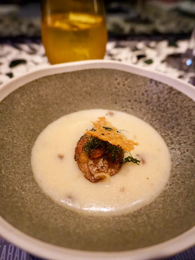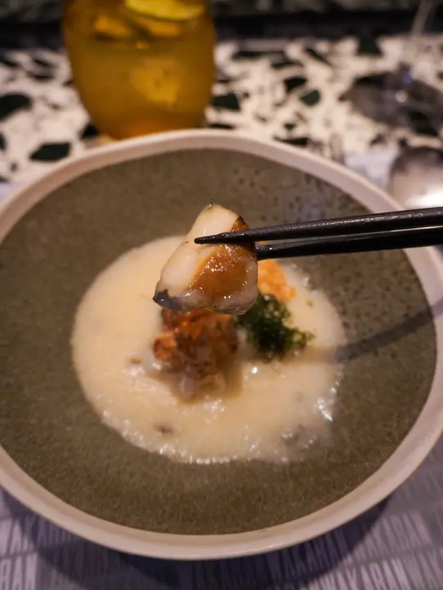 鮑魚粥用咗韓國粥嘅概念,比起香港嘅潮州粥濃稠,加入雞汁煮成。南非鮑魚慢煮二十四小時,口感十分軟嫩,旁邊仲有雞皮脆脆😆