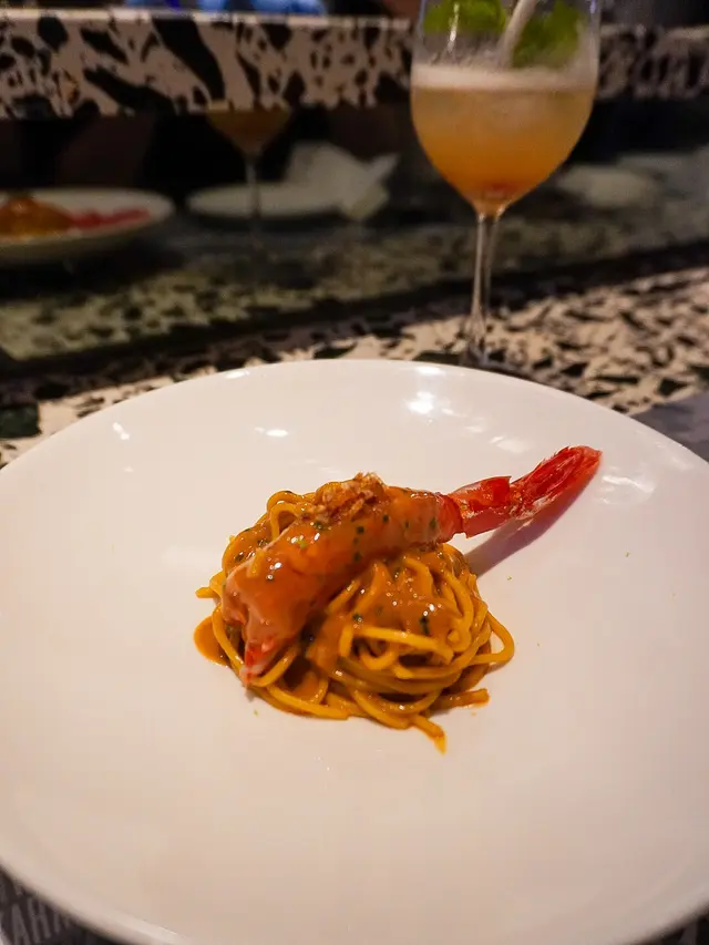 睇住大廚係到兜啲意粉已經知道會好好食🥹醬汁用上蕃茄、青檸、蝦汁,意粉係自家製幼蛋麵,味道好濃蝦味。面頭有櫻花蝦同西班牙紅蝦🦐味道相當鮮甜!