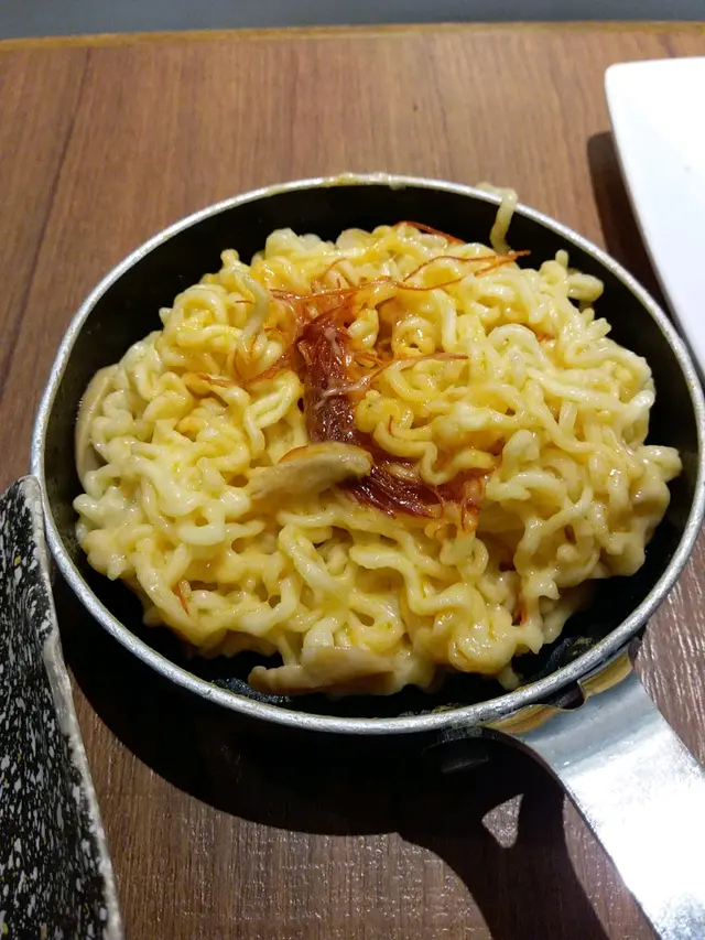 之後繼續是芝士控的福音,磯燒主食有幾款,其中兩款都有芝士。首先是火山芝士麵,店員會把這一小盆 芝士撈公仔麵放在磯上加熱,然後撈好,變成芝味濃濃的芝士麵。