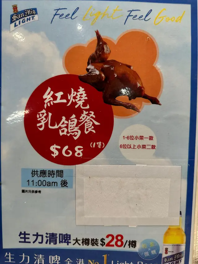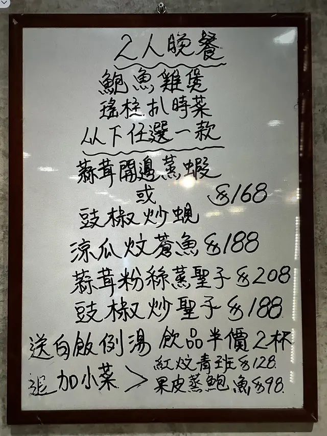 大角咀平民街坊小菜 瘋雲等级42024-11-23297 浏览 关注 今晚和住在大角咀的朋友吃晚飯。我們揀選了「二人晚餐」,小菜味道好,份量十足。二人實在吃得很飽。鮑魚雞煲鮑魚和雞肉都吸收了濃郁的湯汁,每一口都充滿鮮甜。雞肉嫩滑,鮑魚鮮美,佐飯一流。瑤柱扒時菜瑤柱搭配白菜,口感和味道均衡,白菜爽脆,瑤柱鮮香。玻璃芡汁亦做得十分出色。蒜茸粉絲蒸聖子聖子份量十足,大大隻,每人有兩隻,肉質鮮嫩。蒜茸十分香,粉絲很滑順,令人一口接一口的吃。乳鴿紅燒乳鴿的表現也相當出色,皮脆而不焦,肉質鮮嫩,十分入味。這間冰室的食物種類繁多,包括一人晚餐、火鍋、小菜、炒粉麵飯等,且價錢相宜。2以上食记乃用户个人意见 , 并不代表OpenRice之观点。赞好分享大角咀平民街坊小菜 金怡冰室 https://s.openrice.com/QrLT0OL5O00检举 张贴 评分5味道4环境4服务4卫生5抵食用餐途径堂食