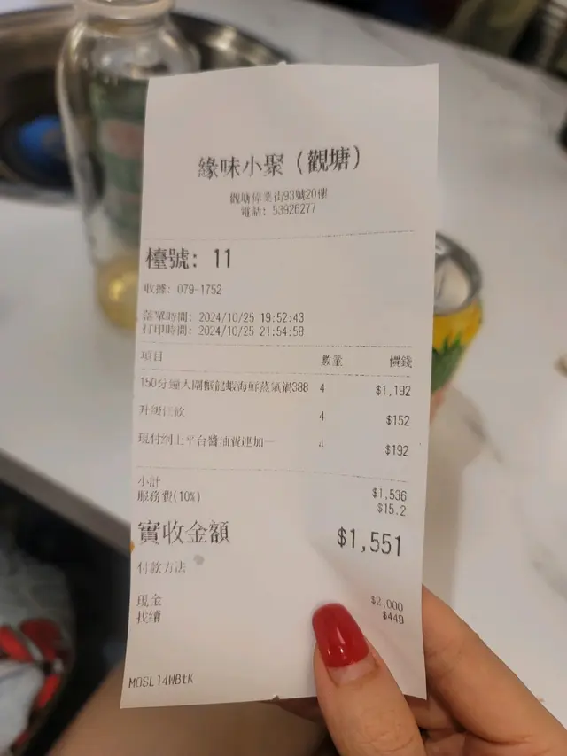 大閘蟹龍蝦海鮮蒸氣鍋 Victoria Y等级42024-11-0110K 浏览 关注 緣味小聚,位於觀塘偉業街93號93WYS20樓。餐廳環境比較狹窄,我們點了大閘蟹龍蝦海鮮蒸氣鍋(150分鐘) $298位、升級任飲$152(4位) 、醬油連加一$192(4位) 。 大閘蟹龍蝦海鮮蒸氣鍋大閘蟹龍蝦海鮮蒸氣鍋每人有半隻龍蝦,還有鮑魚、生蠔、海蝦和蜆, 味道正常。 大閘蟹有公和乸兩款, 細細隻,但都有膏。 然後有蒸牛肉、豬肉、肉丸、蔬菜和甜品。 大閘蟹龍蝦海鮮蒸氣鍋大閘蟹1大閘蟹甜品豚肉整體正常發揮,唔算突出。 🏷️溫馨提示~ 整個用餐體驗均屬個人分享意見, 只作參考😊。 63596緣味小聚 (93WYS)地址: 觀塘偉業街93號93WYS20樓以上食记乃用户个人意见 , 并不代表OpenRice之观点。赞好分享大閘蟹龍蝦海鮮蒸氣鍋 緣味小聚 (93WYS) https://s.openrice.com/QrLT0ASrN00检举 张贴 评分3味道2环境2服务2卫生3抵食用餐日期2024-10-25用餐途径堂食用餐时段晚餐
