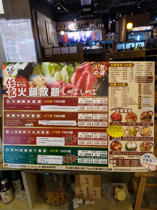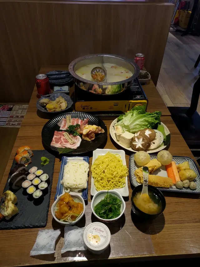 包括濃湯蕃茄鍋、朝鮮泡菜鍋、日式地獄鍋小辣、日式壽喜燒鍋、胡椒豬肚鍋、養生藥膳醉雞鍋、鵝血麻辣鍋、北海道日出昆布豆腐鍋,多加$20就可以有,鴛鴦鍋。