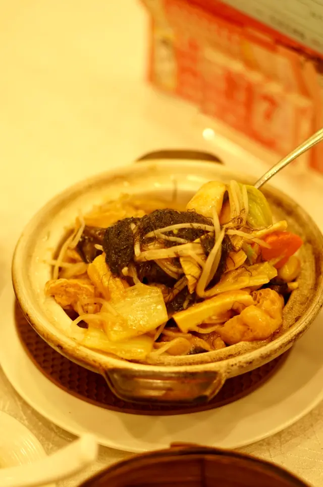 【南乳粗斋煲】一煲热腾腾的素菜吃出了不少肉菜都没有的满足和气魄,不仅是纷呈的食材盛惠,口感又很协调。该脆的清脆十足,该嫩的嫩弹滑软,南乳酱咸鲜中带甜,让浓厚发亮的勾芡也不显得腻。最爱其中的银耳,吸收了酱汁之精华。