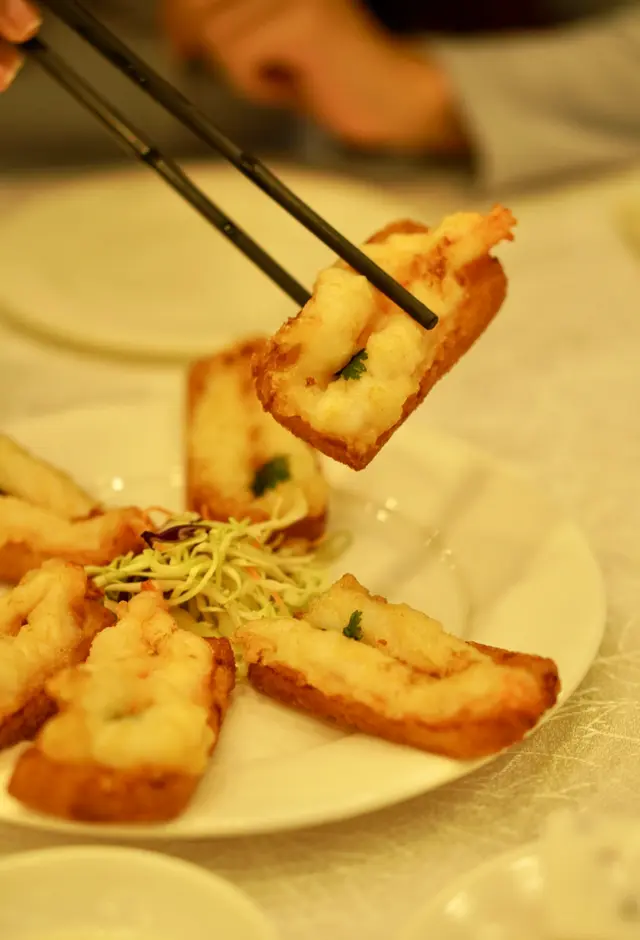【沙律虾多士】大块虾肉的鲜甜与油炸吐司块的酥香糅合在一起,每次咀嚼都爆出一口香浓,不愧是招牌。