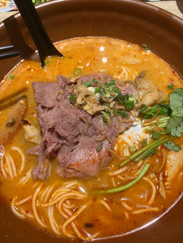 其實我好少食沙嗲王,有一日同朋友去唱K田諗住食啲嘢,所以近近哋去咗沙嗲王。由於我唔係咁鍾意食飯嘅關係,所以冇叫到佢最穩陣嘅招牌嗰啲白咖喱飯,叫咗一個牛肩胛肉冬陰功湯面,我真係非常唔建議你哋叫呢個湯底,比較淡味,應該叫沙嗲湯底會好啲。個麵我揀咗日式幼麵,都係麻麻地,我諗主要係個配搭嘅問題,應該有第二款好食啲嘅嘢。🤣😩