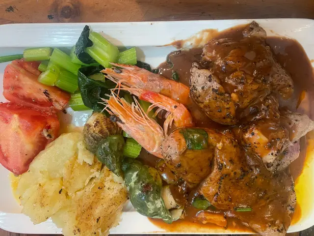 牛魔王套餐1號包左12盎肉眼、法國水晶蝦、翡翠螺。隨餐跟西湯、汽水、鳳凰卷(??)同埋一份小食 -- 半隻燒雞。
