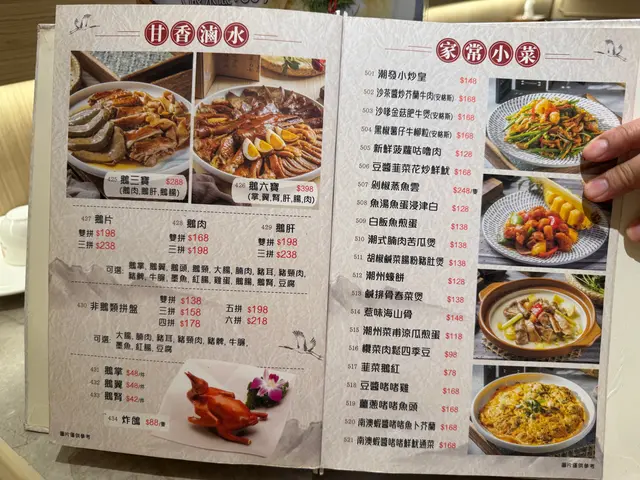 餐廳都幾大間,有兩層,裝修好新,晚餐都算多人。餐牌有好多菜式,除咗傳統嘅潮州菜之外,仲有啲比較新穎嘅菜式和小菜。