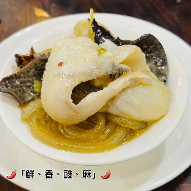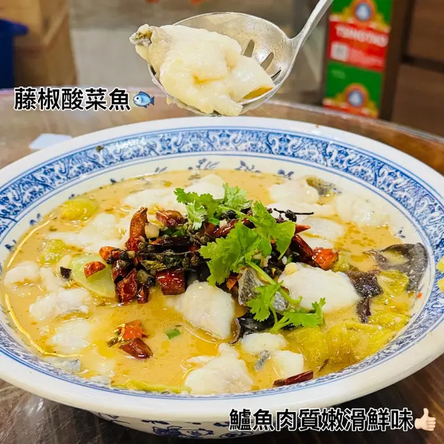 招牌酸菜魚👍🏻我揀咗鱸魚轉番薯粉底,一大碗嘅份量足夠三四人分享,湯底每日以新鮮魚骨湯熬製,絕無味精就算飲埋啲湯都唔會覺得口渴,鱸魚肉質非常嫩滑鮮味,並且唔會有細骨,最適合用作酸菜魚,湯底加入大量酸菜、木耳、萵筍同番薯粉,「鮮、香、酸、麻」味道層次非常豐富,酸酸辣辣十分開胃