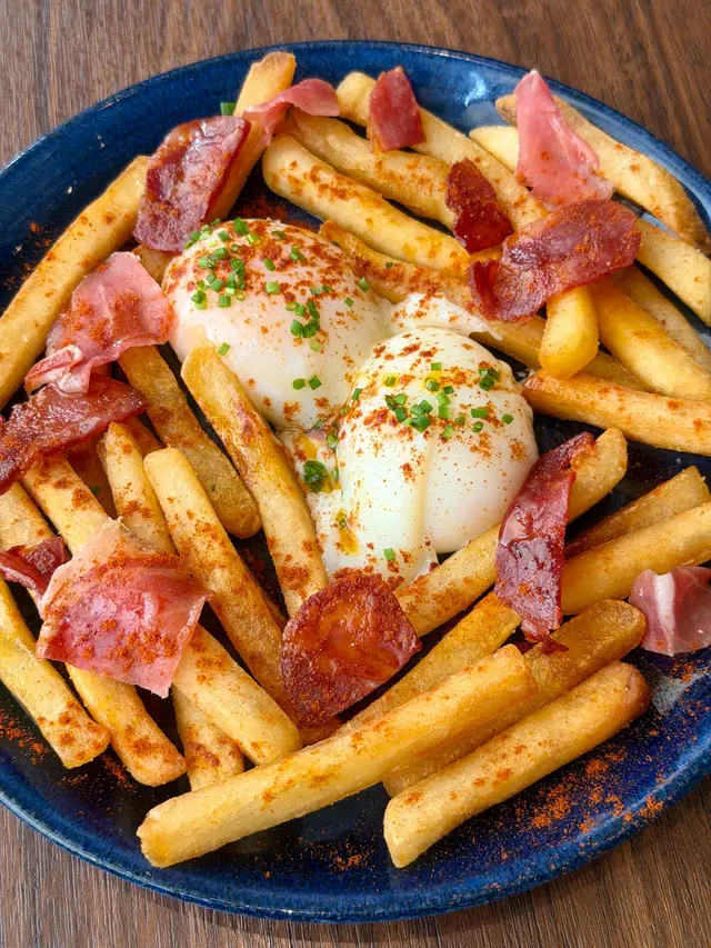 流心蛋配西班牙辣腸及脆薯 Broken Eggs with Chorizo and Fries:溫泉蛋加野菌加少少 Chorizo 同 jamón 同埋薯條,組合幾得意🤣