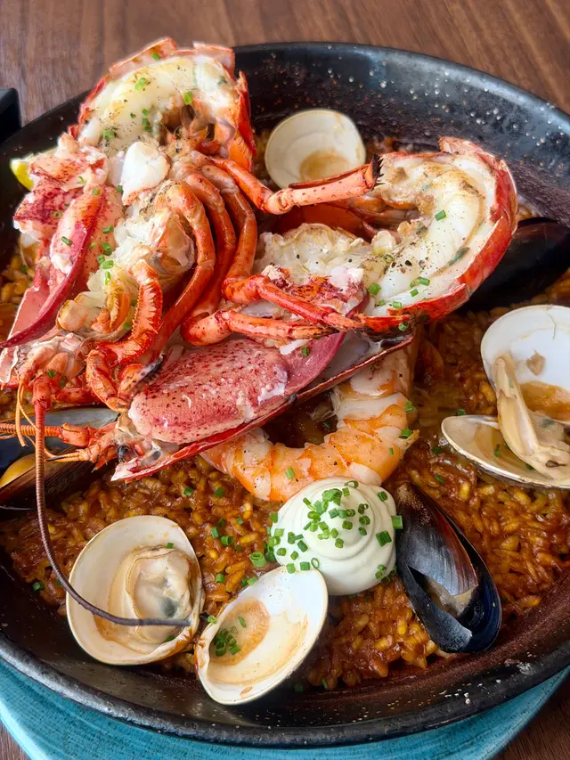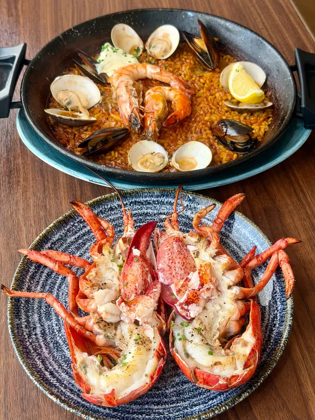 西班牙海鮮飯(最少2位起)Seafood Paella Barcelona (minimum 2 ppl)加配半隻波士頓龍蝦(+$128)x 2 :Paella 我真係食唔少🤩,由最傳統嘅 Paella valenciana 到 Paella de marisco (seafood paella) 到發展落嚟各地各種不同版本 都有食過吓😆;呢日嘅 Paella 🥘 有 魷魚🦑、蜆、青口、蝦🦐,我哋仲額外加咗龍蝦🦞🤩,龍蝦肉鮮甜,廚師仲竟然將龍蝦鉗完全去咗龍蝦殼,食得超級方便兼爽快🤩;又用咗西班牙🇪🇸Bomba 米粒粒都圓轆轆脹卜卜不過澱粉含量相對偏低,用嚟煮Paella 🥘西班牙飯非常合適,亦都好美味🤣