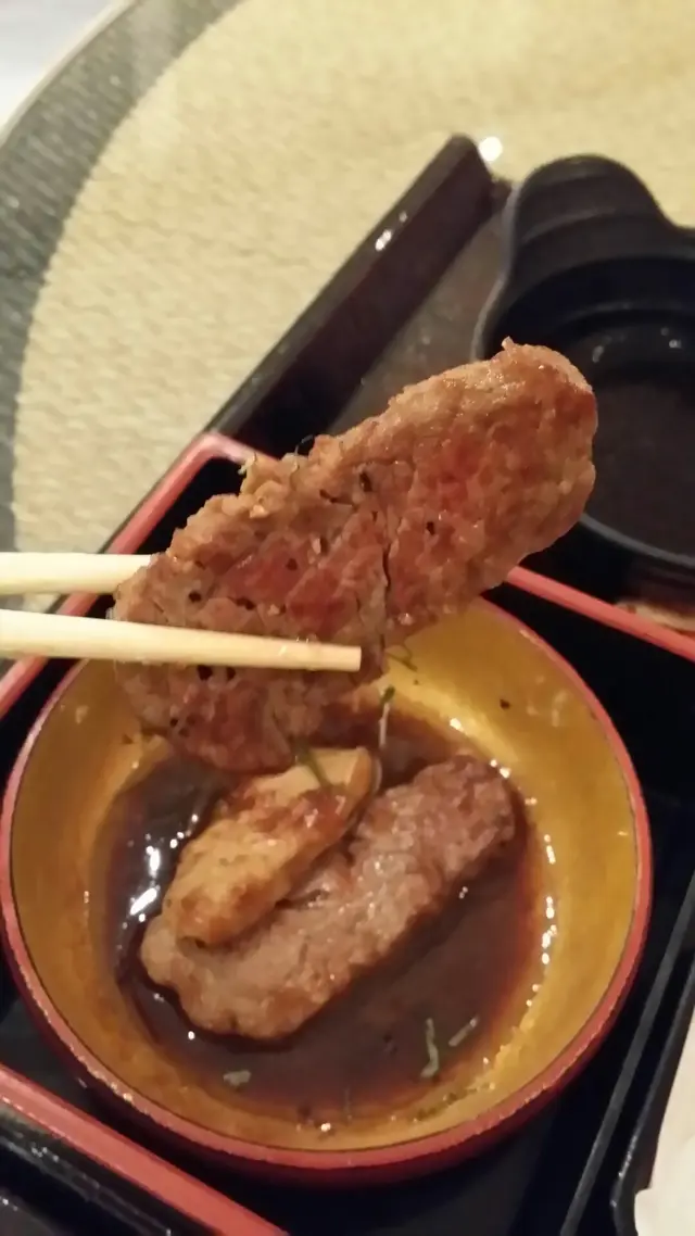 跟着食的是「白鮨」的「香煎鵝肝配牛柳」,「白鮨」用上竹籤把鵝肝跟牛柳雖在一起,鵝肝上面還附上了少許的香蔥。