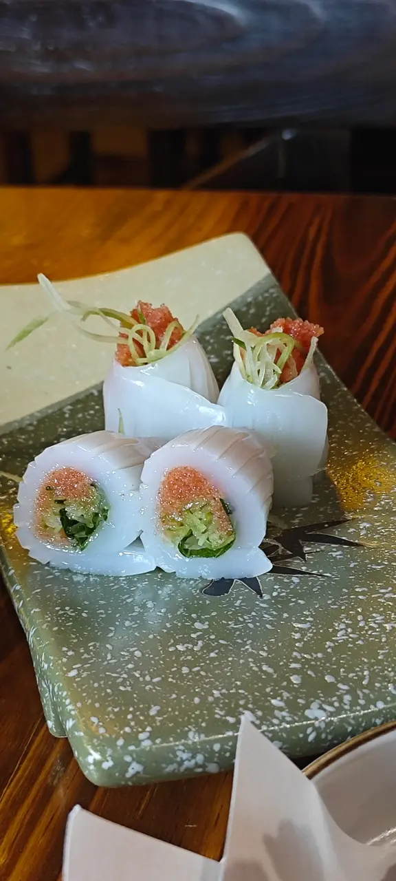 魷魚爽口彈牙,入面釀咗明太子、紫蘇葉同青瓜絲,味道鹹中帶酸,清新又有層次