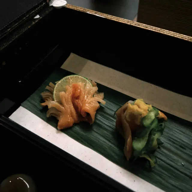 有話梅jelly 係面的珍珠蠔 + 醬油漬長崎中toro + 花雕酒漬北海道赤牡丹蝦