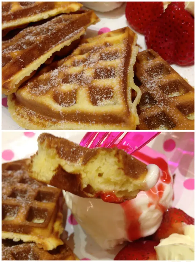 雖然如此,一吃下去實在讓人失望!主角四塊鬆餅是軟身的,完全沒有外脆內軟的口感,中間還好像沒焗透的樣子,黏黏糯糯的,口感頗為奇怪;鬆餅的蛋香味也欠奉,應該說鬆餅本身是沒什麼味道的,水準讓人非常失望,連街邊十多塊的格仔餅也比它好吃,就算有八折也完全不值這個價錢。